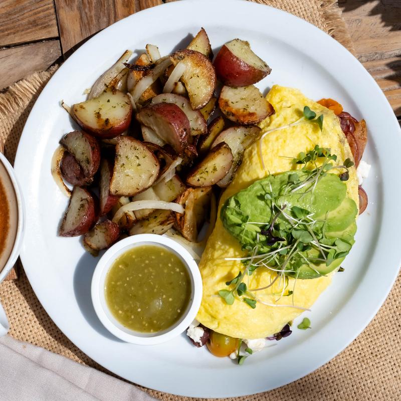 Three scrambled eggs, house potatoes, avocado spread, chihuahua cheese wrapped in a flour tortilla with choice of bacon, sausage, turkey link, ham, or veggie (Zucchini, spinach, onion).