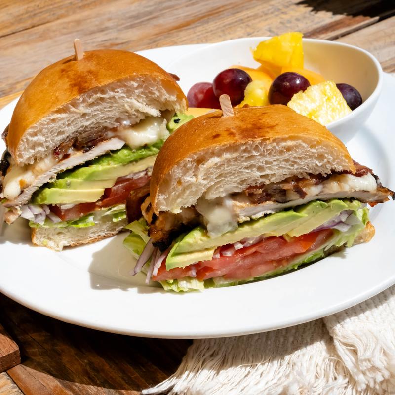 Roasted turkey breast, Swiss cheese, avocado spread, green leaf lettuce, roasted tomato, and chipotle mayo. Served on a French roll.