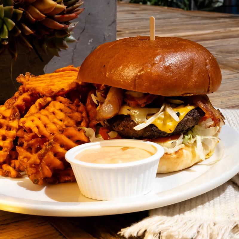 8oz. natural beef patty, shaved lettuce, roasted tomato, grilled onions, jalapeño mayo, and chipotle jam, choice of cheese, served on a brioche bun • Add Bacon +$5.00 | Add an Egg +$3.00