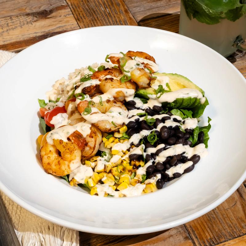 Grilled shrimps, romaine lettuce, brown rice, roasted corn, black beans, fresh avocado, cherry tomatoes, green onions with cilantro lime dressing.