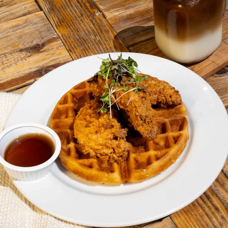 Belgian waffle topped with buttermilk fried chicken tenders and jalapeno maple syrup.