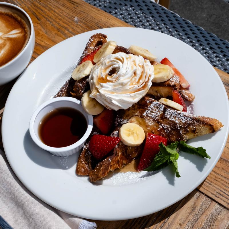 Hawaiian bread, ham, turkey, Swiss cheese, and dip into a French toast mix. Served with homemade raspberry jam.